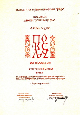 - Заједница архива Србије је поводом десетогодишњице рада, 1979. године, доделила Историјском архиву у Врању Повељу са плакетом,
