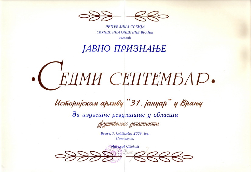 - Поводом Дана града, 7. септембра 2004. године, Скупштина општине Врање доделила је Историјском архиву у Врању Јавно признање „Седми септембар“
