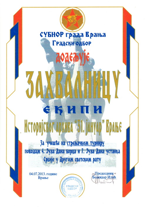 - За учешће на стрељачком турниру организованом 2013. године поводом 4. и 7. јула, Дана борца и Дана устанка Србије у Другом светском рату,