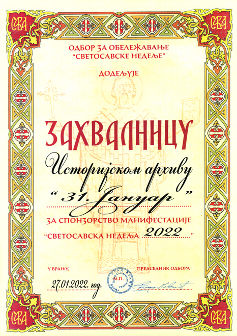- Одбор за обележавање „Светосавске недеље“ доделио је 2022. године Историјском архиву у Врању Захвалницу за спонзорство манифестације „Светосавска недеља 2022“.
