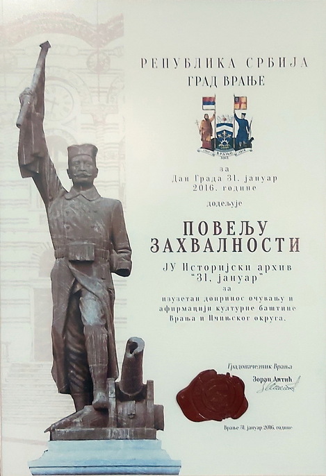 - За Дан града, 31. јануар 2016. године, Град Врање доделио је Историјском архиву у Врању „Повељу захвалности“