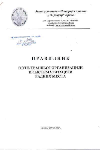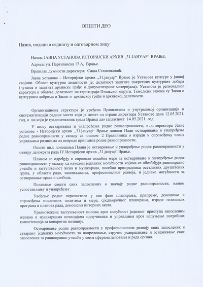 Управљачка акта Штампа Правилник о унутрашњој организацији и систематизацији радних места: План управљања ризицима од повреде принципа родне равноправности: Претходни чланак: Управни и надзорни одбор Претходна Следећи чланак: Збирке Следећа