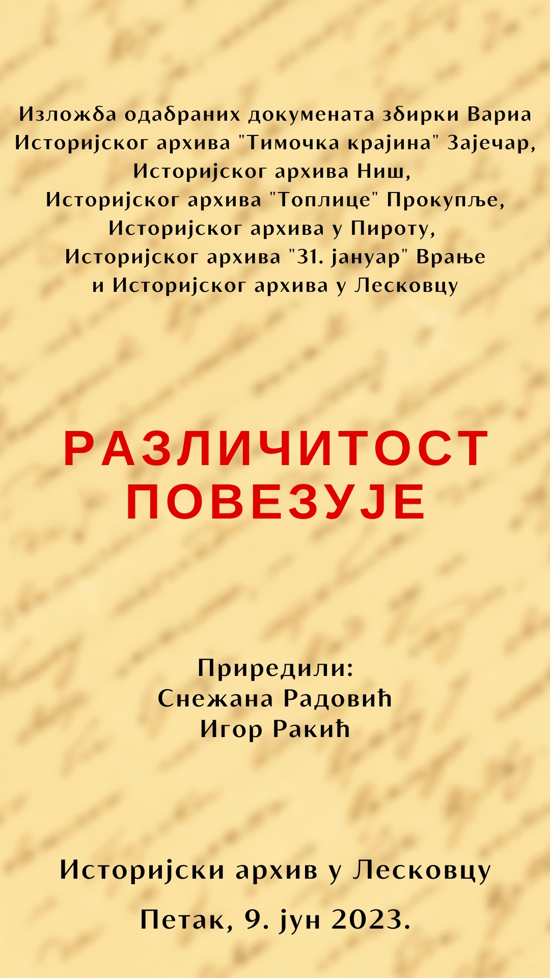 Изложба „Различитост повезује“, која је настала заједничким радом историјских архива у Лесковцу, Пироту, Прокупљу, Нишу, Врању и Зајечару, тренутно је пред нишком публиком. На отварању су се присутнима обратили директорка Историјског архива Ниш Снежана Радовић, директорка Историјског архива Лесковца Марија Лазаревић, а изложбу је отворио директор Историјског архива "31. јануар" Врање, Саша Стаменковић.