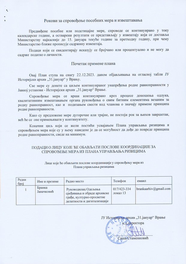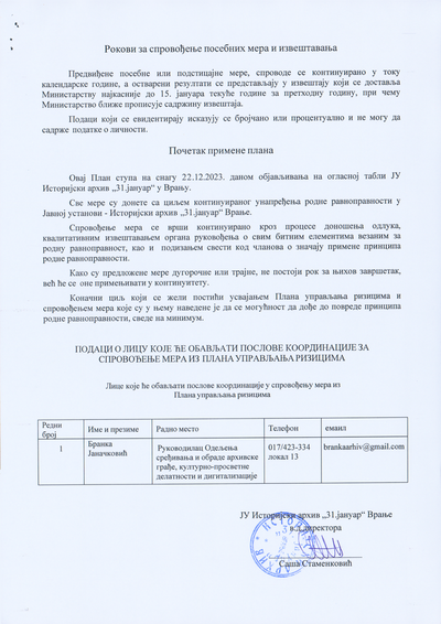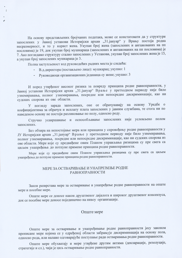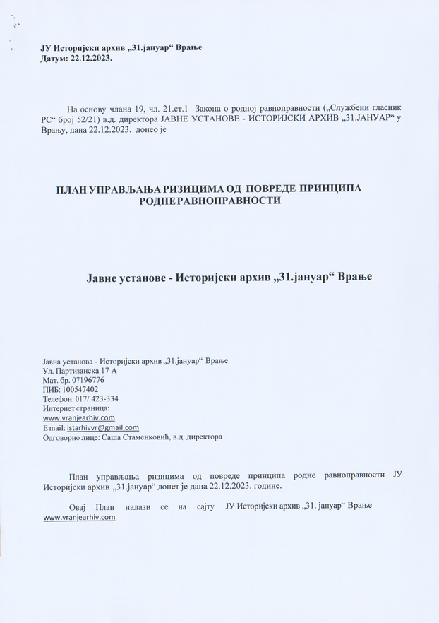 Управљачка акта Штампа Правилник о унутрашњој организацији и систематизацији радних места: План управљања ризицима од повреде принципа родне равноправности: Претходни чланак: Управни и надзорни одбор Претходна Следећи чланак: Збирке Следећа