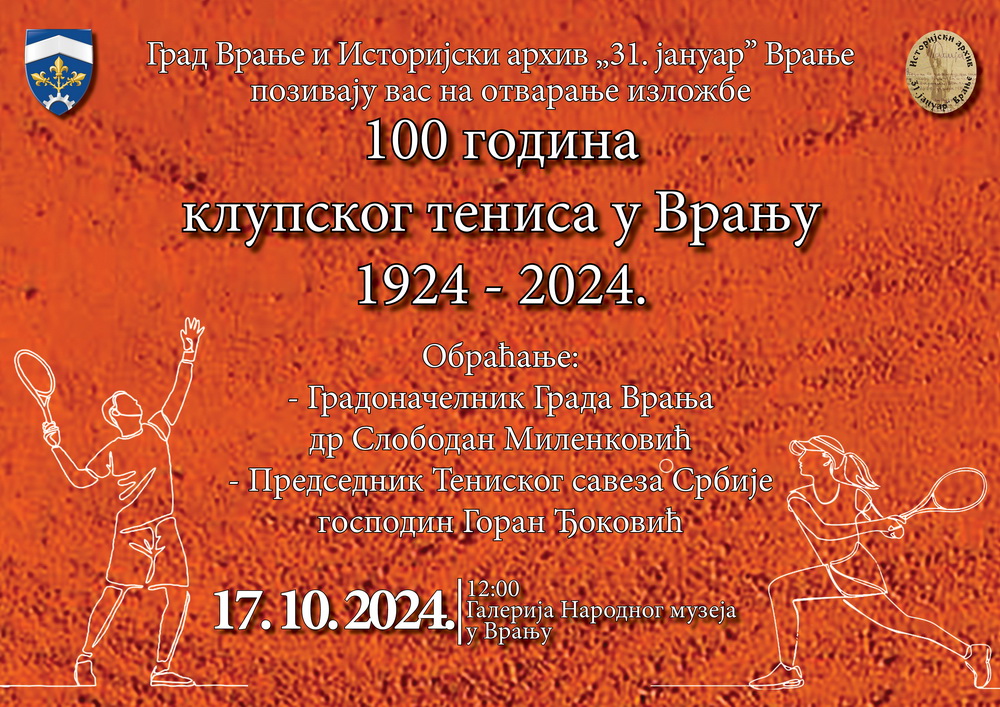 У оквиру обележавања великог спортског јубилеја, у Галерији Народног музеја, отворена је изложба ,,100 година клупског тениса у Врању 1924-2024.“ чији су аутори Александра Јанчић, Весна Цветковић Славица Димитријевић и Мирољуб Миша Стојчић.
