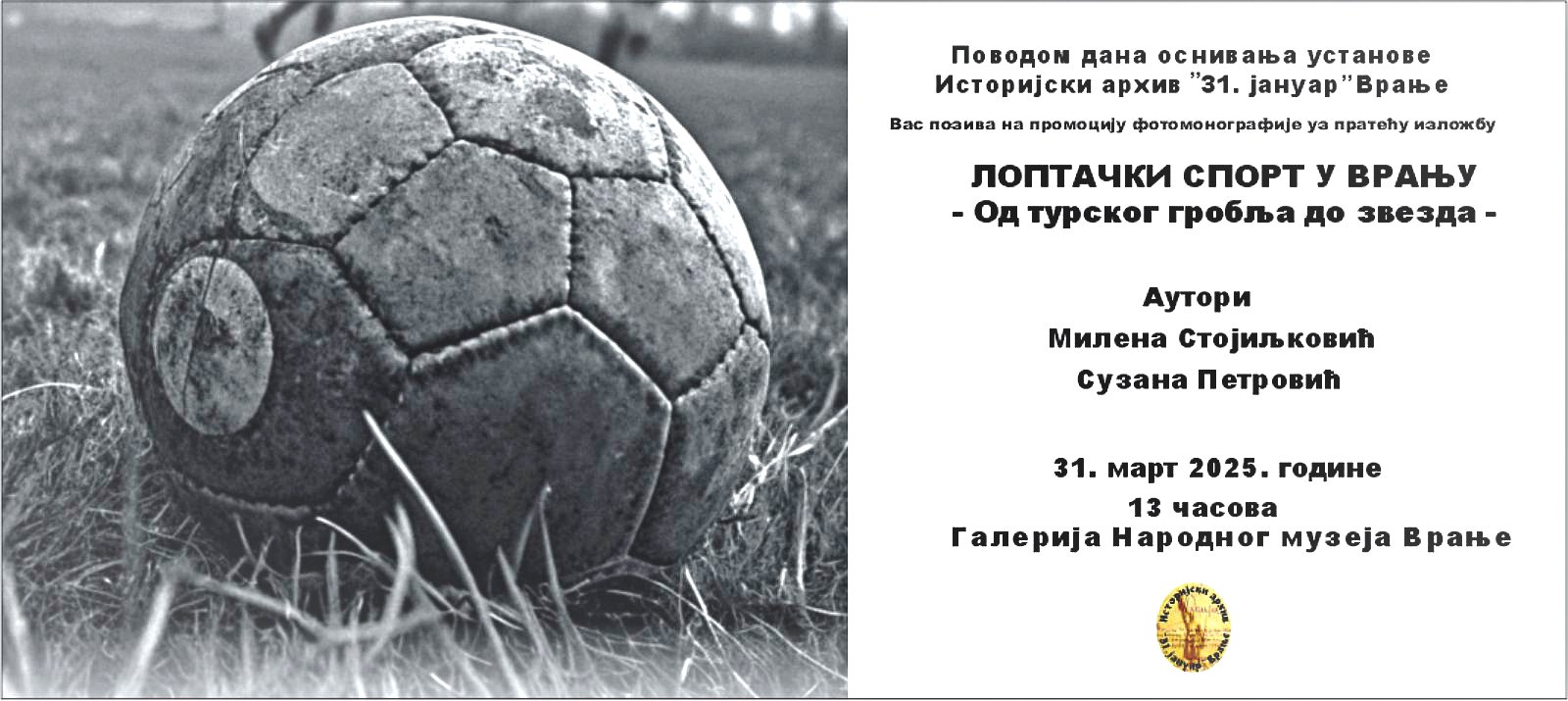 Поводом 63 године од оснивања, Историјски архив ,,31. јануар" Врање организује промоцију фотомонографије и отварање изложбе ,,Лоптачки спорт у Врању - Од турског гробља до звезда ", аутора виших архивиста Милене Стојиљковић и Сузане Петровић.